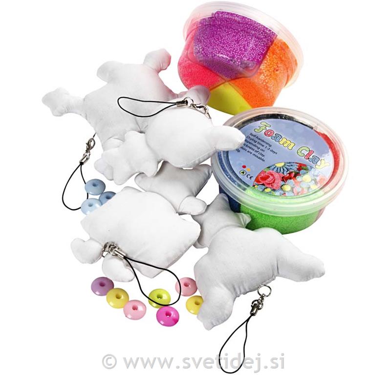 Set Vsebuje: 4 figurice iz blaga, 2x50 g Foam Claya, 10 plastičnih perl in navodila.