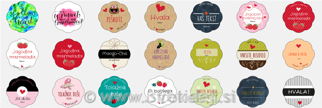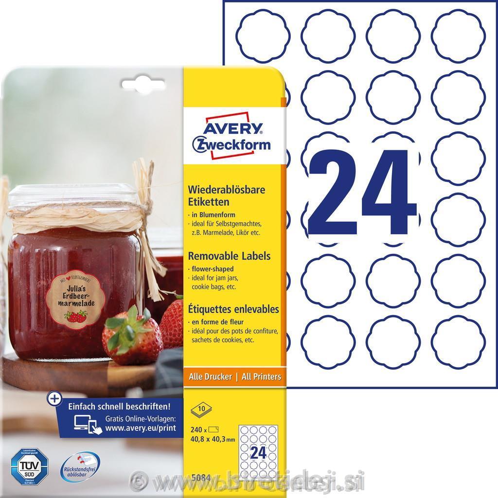 Etikete art. 5084, 40.8 x 40.3 mm, imajo obliko cveta in odstranljivo lepilo. Odlične so za označevanje doma narejenih izdelkov, na primer: kozarcev z marmelado, steklenic z likerjem, vrečk s piškoti. Imajo zanesljiv in dober oprijem na steklu, plastiki in papirju ter se jih odstrani, ne da bi pri tem ostali ostanki lepila. Primerne so za tiskanje z vsemi običajnimi laserskimi tiskalniki in se med tiskanjem ne bodo zatikale, saj so preizkušene s TÜV SÜD. Hitro in enostavno oblikujte in natisnite etikete z brezplačnim programom Avery Design & Print, kjer so že v naprej pripravljene predloge.
