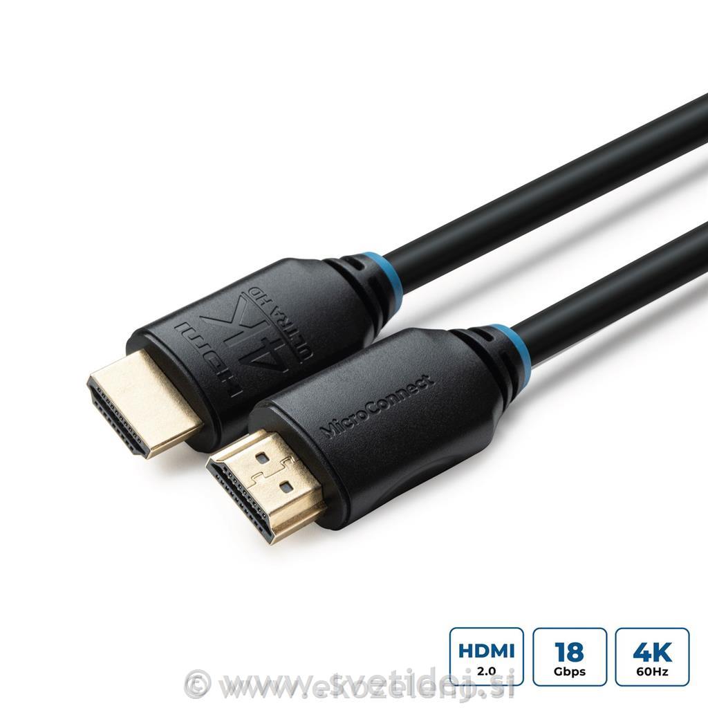 Izjemno hiter kabel HDMI 2.0 4K@60Hz 18Gbit z dinamičnim HDR in povratnim zvočnim kanalom (ARC). Podpira ločljivosti do 4K in frekvence osveževanja do 60 Hz.