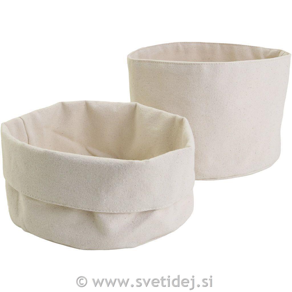 Elegantne in praktične košare iz debelega bombaža. Lahko se okrasijo z barvami/flomastri za tekstil, efektnimi podlogami, decoupageom za prtičke itd. Višino je mogoče nastaviti z zlaganjem zgornjega roba navzdol.