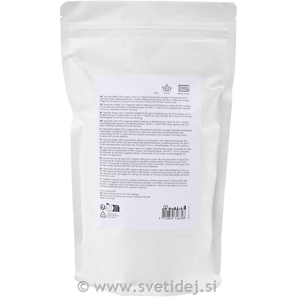 Sojin vosek v kosmičih, 100 % veganski. Popoln za vse, ki želijo vlivati ??prostostoječe sveče, kot so stebrne sveče in figuralne sveče. Proizvede 80–90 % manj saj kot tradicionalne sveče. Temperatura taljenja: 65–85 °C. Dodajte na primer barvilo in/ali dišavo. Čas sušenja: 6–8 ur. Čas strjevanja: 48 ur pred uporabo.