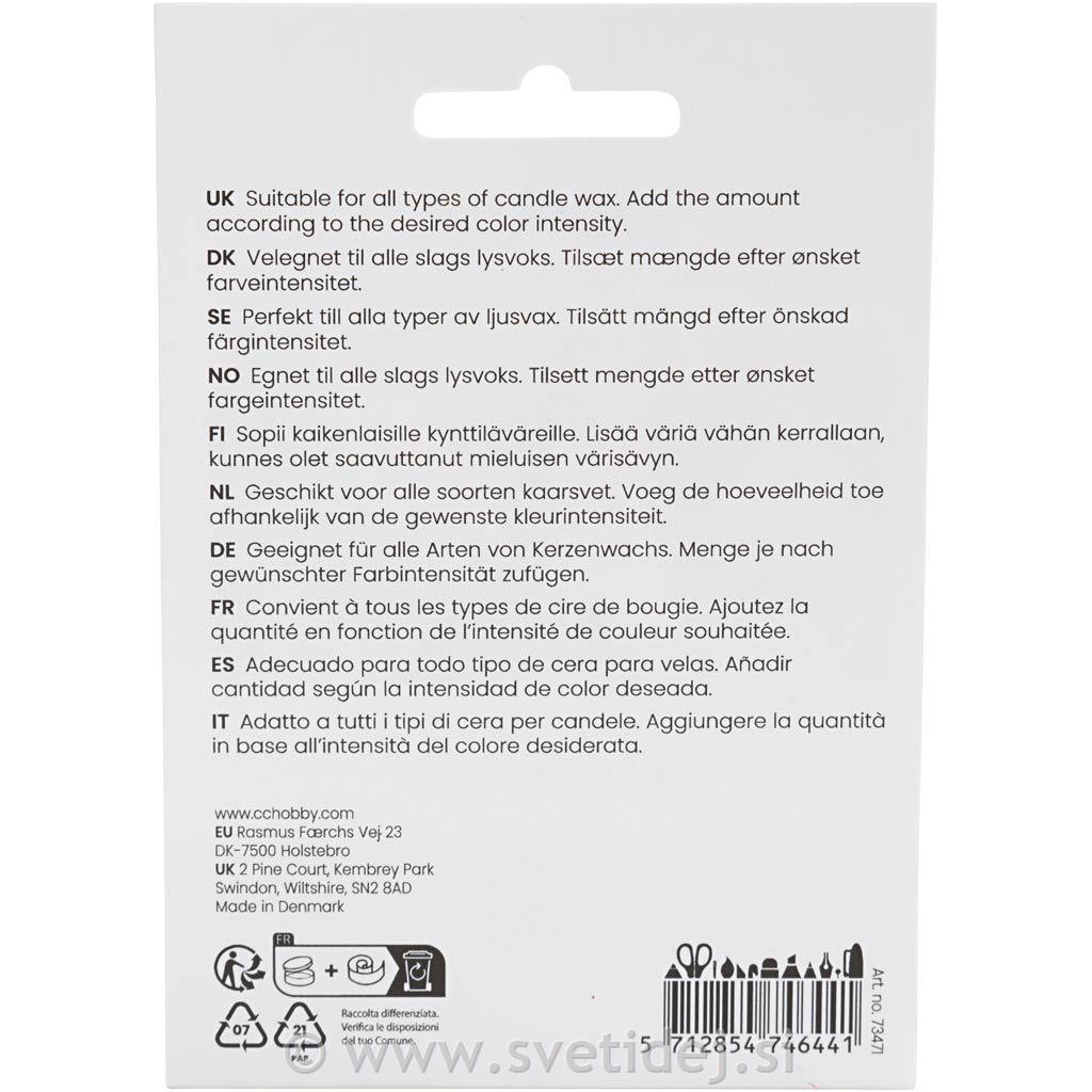 S tem barvilom za sveče lahko ustvarite svoje edinstvene sveče v čudovitih barvah. Primerno za sojin vosek, parafin in druge voske za sveče.