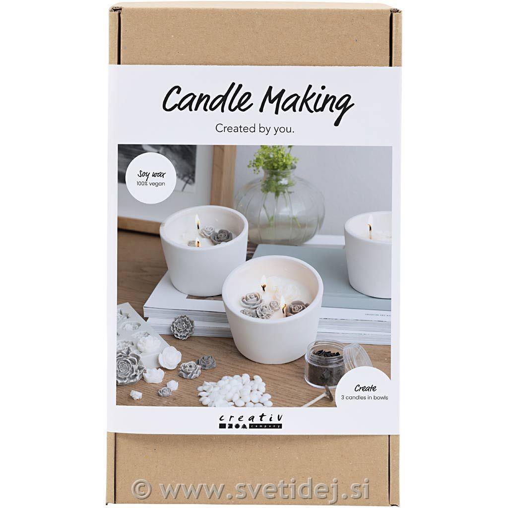 Naša postavitev Creativity in a Box vam omogoča, da ustvarite svoje luksuzne sveče – elegantne, stilske in z vrtnicami na vrhu. Vsebuje materiale za tri sojine sveče in vsa potrebna navodila.