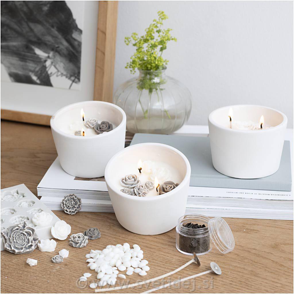 Vsebina: sojin vosek, barvilo za sveče, stenj za sveče, terakotne sklede, silikonski kalup z vrtnicami.