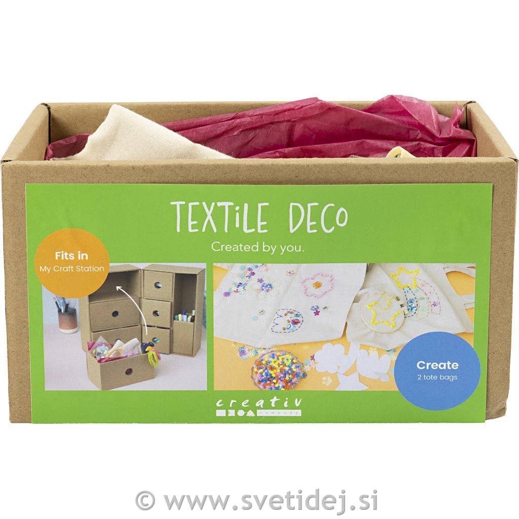 Ta predal je popoln dodatek k vaši obstoječi My Craft Station za tekstilno dekoracijo. Prejmete dve torbi, ki ju lahko okrasite s preprostimi vezeninami v čudovitih barvah. S priloženimi šablonami narišite vzorce na blago in izvezite z pisano prejo. Dodate lahko tudi taljene perlice in bleščice, da ustvarite vznemirljive detajle. Če želite nadaljevati z risanjem vzorcev, lahko uporabite tekstilne markerje iz vaše My Craft Station – ne pozabite le, da jih je treba pritrditi z likanjem, da ostanejo na mestu.