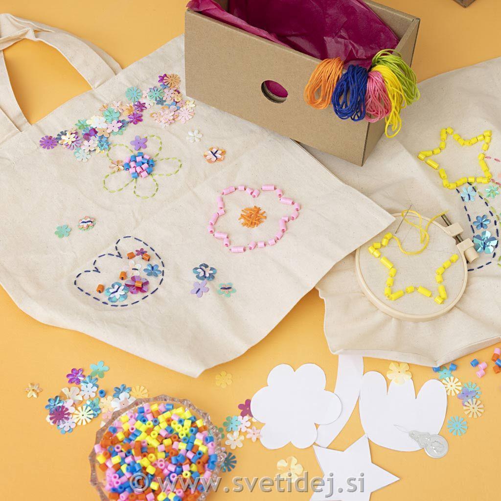Vsebina: Torbe za vezenje, obroč za vezenje, igla za vezenje, vdevalec sukanca v iglo, preja za vezenje, bleščice in taljene perlice.