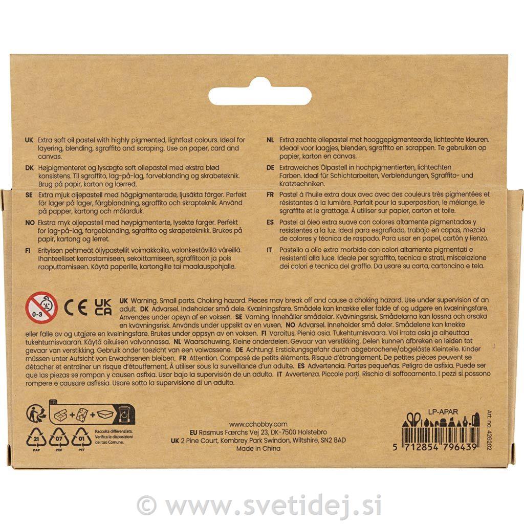 Ti oljni pasteli so narejeni za tiste, ki želijo delati z živahnimi in izraznimi barvami. Zaradi mehke teksture jih je enostavno nanašati in mešati – navdušeni boste nad globino in življenjem, ki ga dodajo vašim stvaritvam. Barve so visoko pigmentirane in obstojne, kar zagotavlja močne odtenke in dolgotrajno obstojnost barve. Vsak pastel je zavit v črn papir z barvno številko, zato jih je enostavno prepoznati in očistiti za delo. Absolutni favorit med ustvarjalci, ki radi raziskujejo različne tehnike.