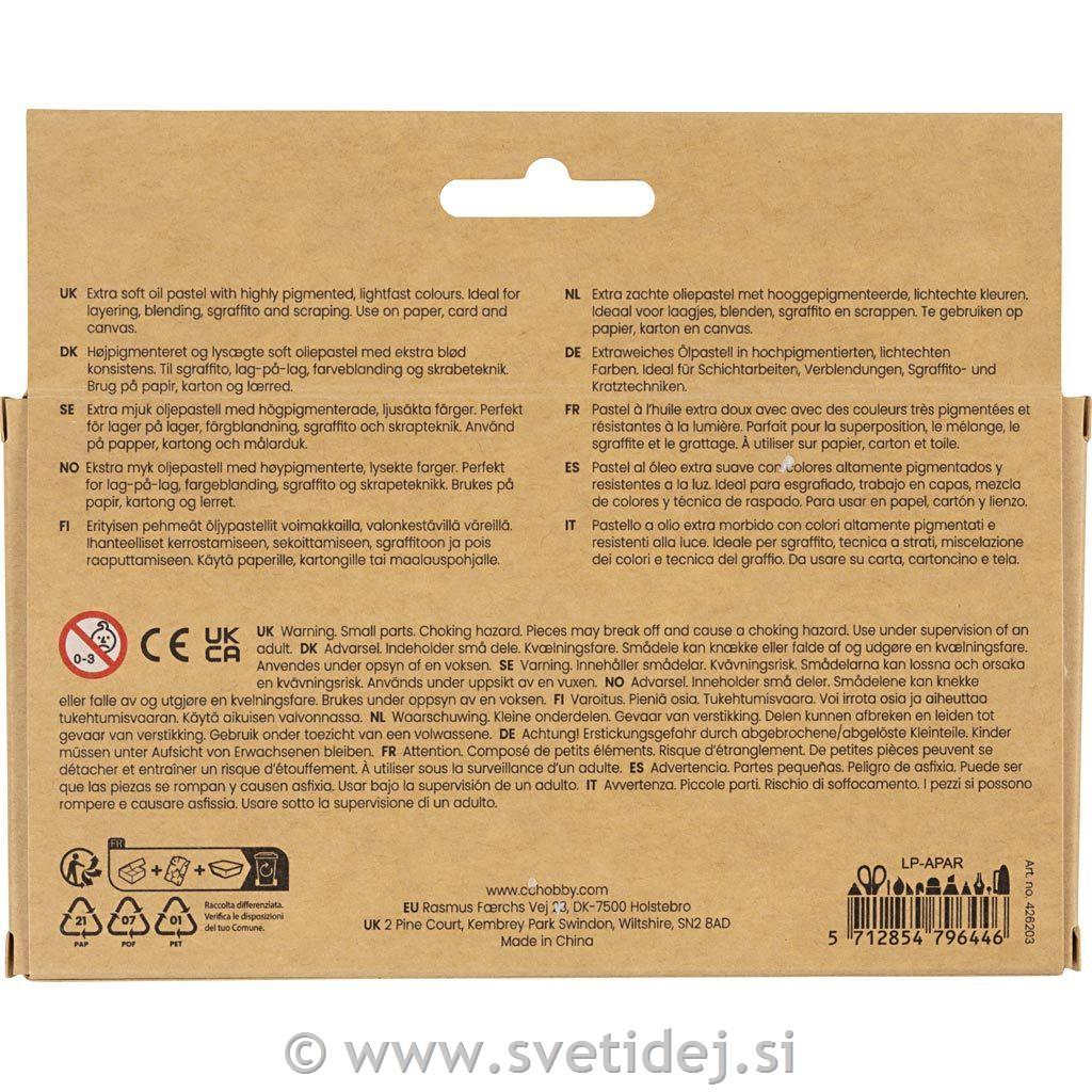 Ti oljni pasteli so narejeni za tiste, ki želijo delati z živahnimi in izraznimi barvami. Zaradi mehke teksture jih je enostavno nanašati in mešati – navdušeni boste nad globino in življenjem, ki ga dodajo vašim stvaritvam. Barve so visoko pigmentirane in obstojne, kar zagotavlja močne odtenke in dolgotrajno obstojnost barve. Vsak pastel je zavit v črn papir z barvno številko, zato jih je enostavno prepoznati in očistiti za delo. Absolutni favorit med ustvarjalci, ki radi raziskujejo različne tehnike.