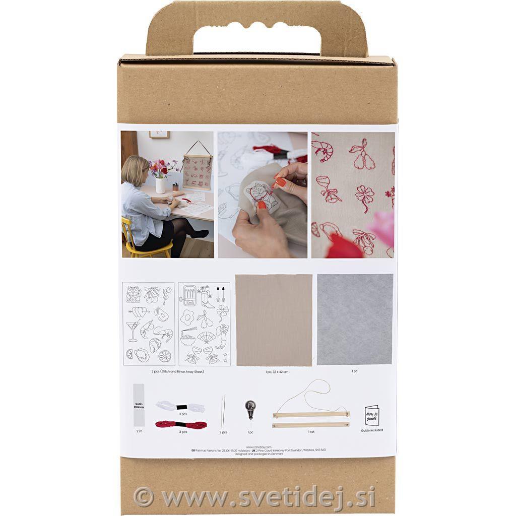 Vsebina: nalepke za vezenje, okvir za plakat, vdevalec sukanca v iglo, šivalna igla, blago, voile, sukanec za vezenje, satenast trak.