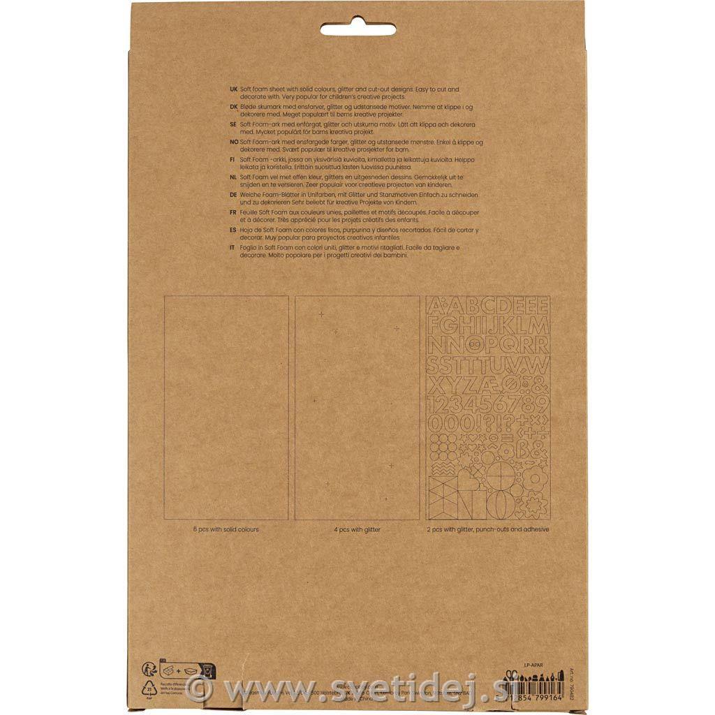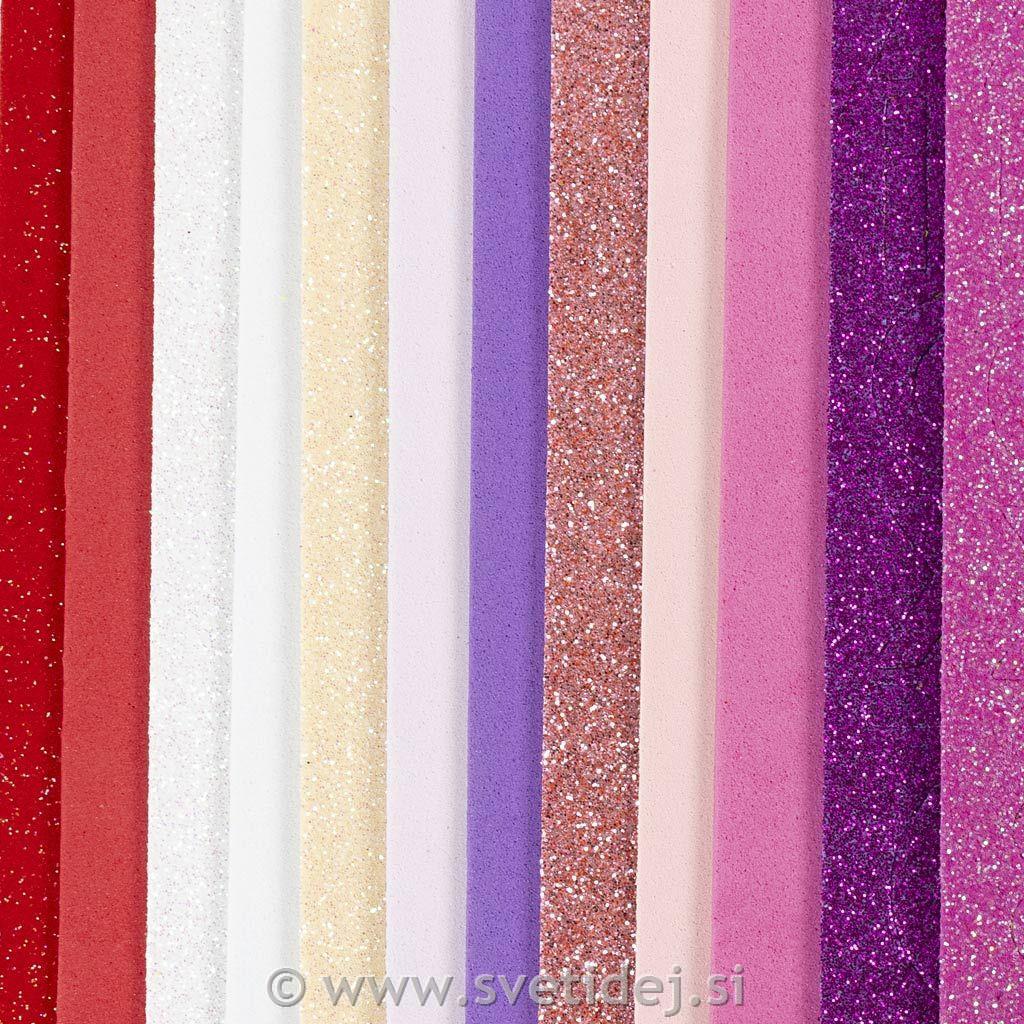 Mehka penasta plošča z enobarvnimi, bleščečimi in izrezanimi vzorci. Enostavno za rezanje in okraševanje. Zelo priljubljena za otroške ustvarjalne projekte.