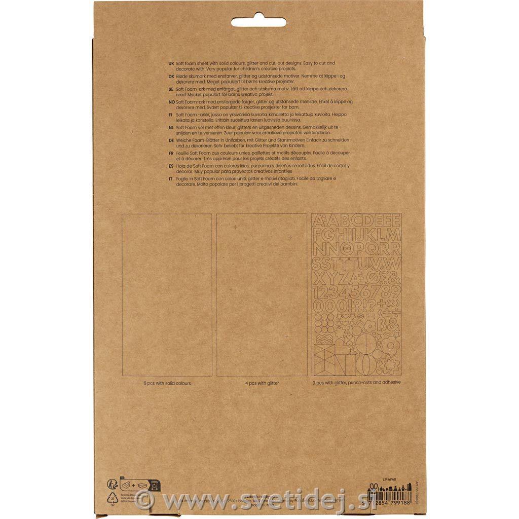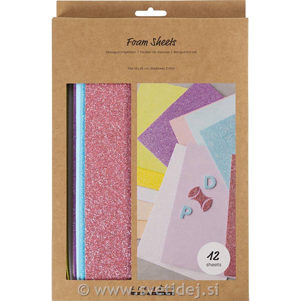 Mehka penasta plošča z enobarvnimi, bleščečimi in izrezanimi vzorci. Enostavno za rezanje in okraševanje. Zelo priljubljena za otroške ustvarjalne projekte.