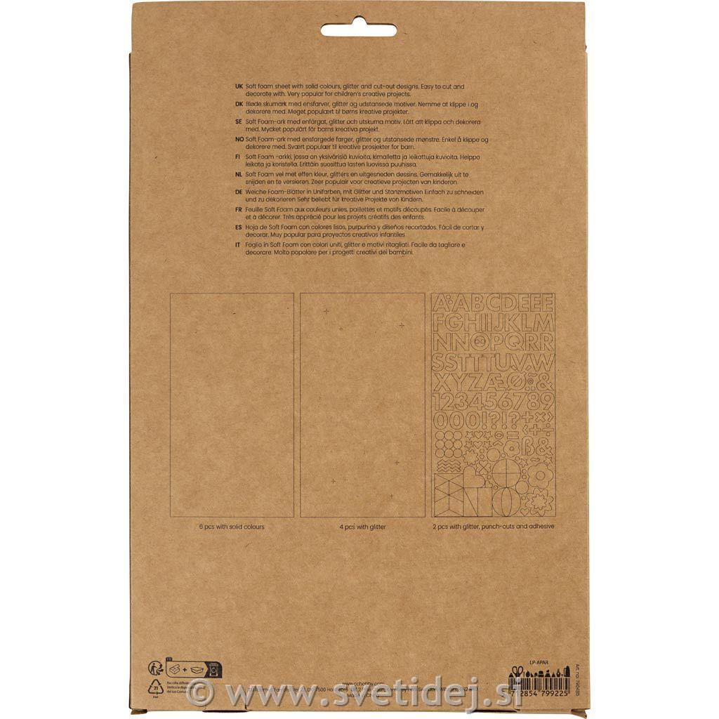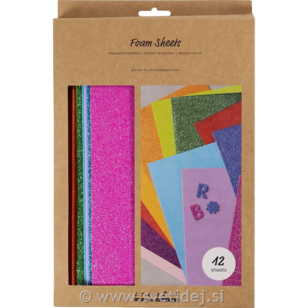 Mehka penasta plošča z enobarvnimi, bleščečimi in izrezanimi vzorci. Enostavno za rezanje in okraševanje. Zelo priljubljena za otroške ustvarjalne projekte.