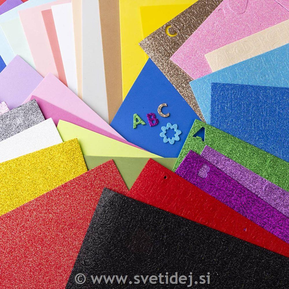 Mehka penasta plošča z enobarvnimi, bleščečimi in izrezanimi vzorci. Enostavno za rezanje in okraševanje. Zelo priljubljena za otroške ustvarjalne projekte.