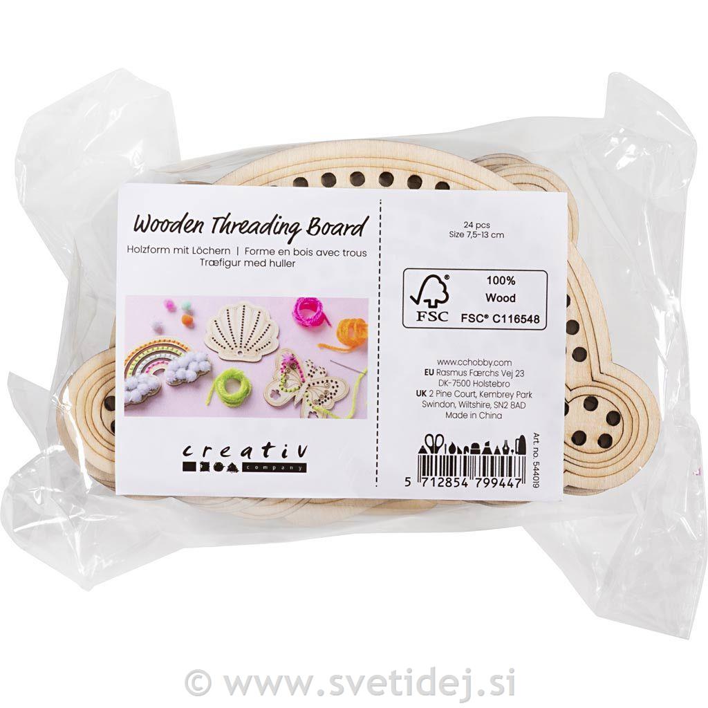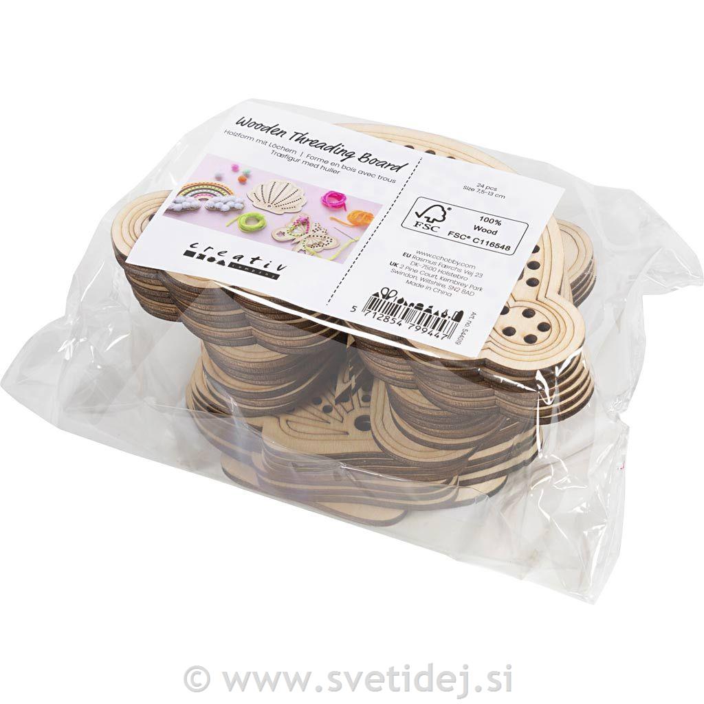 Lesena oblika s predhodno izvrtanimi luknjami, skozi katere je enostavno napeljati vrvico, prejo ali trak. Popolna kot obesek za ključe ali dekoracija v otroški sobi.