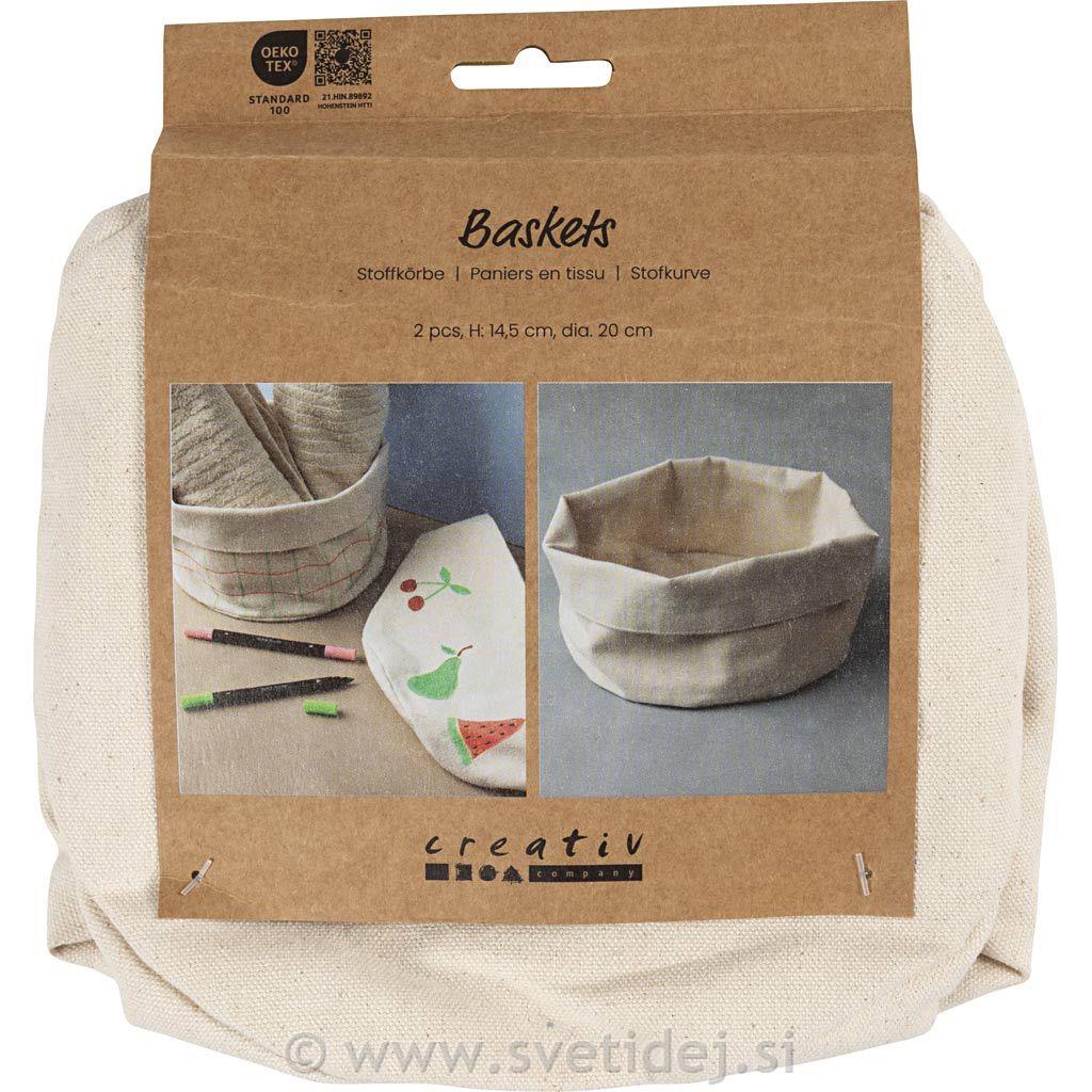 Elegantne in praktične košare iz debelega bombaža. Lahko jih okrasiš s tekstilnimi barvami ali flomastri, efekt linijami, servietno tehniko (decoupage) ipd. Višino košar je mogoče prilagoditi z zavihavanjem zgornjega roba.