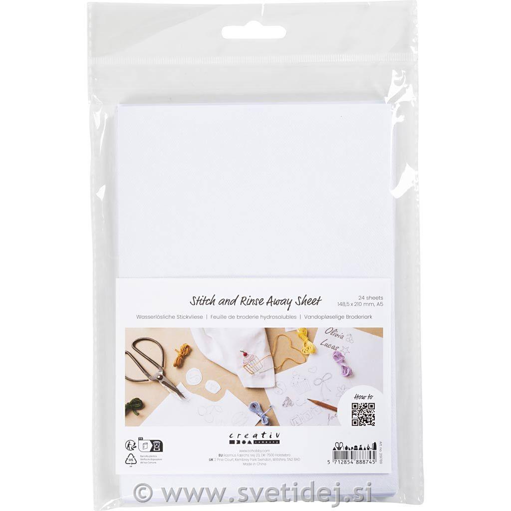 S tem samolepilnim papirjem za vezenje lahko na tekstil izvezete svoje vzorce. Rišite, vezete in opazujte, kako se po uporabi raztopi v vodi.