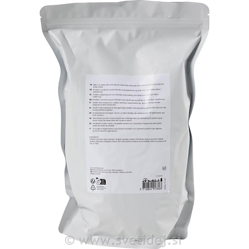 Želite izdelati domača luksuzna mila, ki so odlična za kožo? Ta milna osnova je ravno to, kar potrebujete. Vsebuje olivno olje, zaradi katerega je milo izjemno blago in vlažilno, hkrati pa mu daje svetlo zeleno barvo, zaradi katere je še privlačnejše. Zlahka se topi nad vodno kopeljo, pred vlivanjem v kalupe pa mu lahko dodate tako barvo kot dišavo. Po eni uri je milo pripravljeno za odstranitev – po 24 urah pa imate milo, ki je hkrati dekorativno in vlažilno. Naravno visoka vsebnost vlažilnega glicerina lahko povzroči, da se milo poti, ker glicerin privlači vlago iz zraka, kar lahko povzroči kondenzacijo na milu. Da bi omejili potenje in zagotovili dolgotrajno milo, natančno upoštevajte navodila in postopek. .